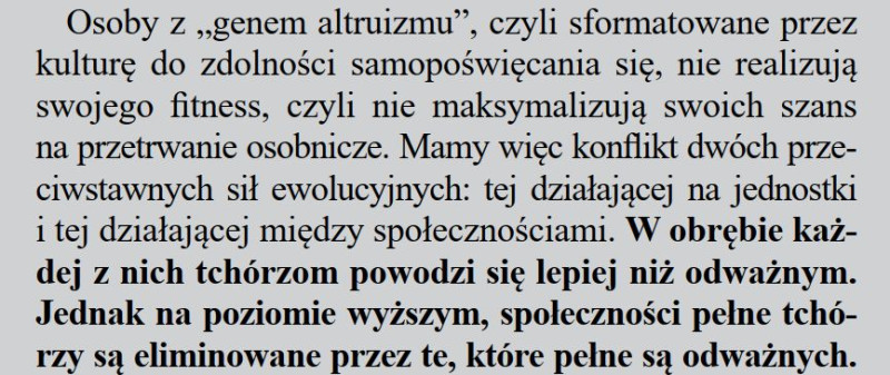 Zniewalanie i eksploatowanie tych w dole, w każdej sferze i skali działania ludzkich społeczeństw, jest przyrodzonym, nieusuwalnym mechanizmem funkcjonowania wszelkich społeczności – od plemion przez narody do wielkich projektów cywilizacyjnych i wstrząsających światem imperiów. Wzajemne zniewalanie, dominowanie, trzymanie w dole… to przetrwanie. Ale przetrwanie kolektywne. Przetrwanie nie nas, a meta-homeostatów, w których jesteśmy, każdy z nas, nic nie znaczącymi trybikami.
