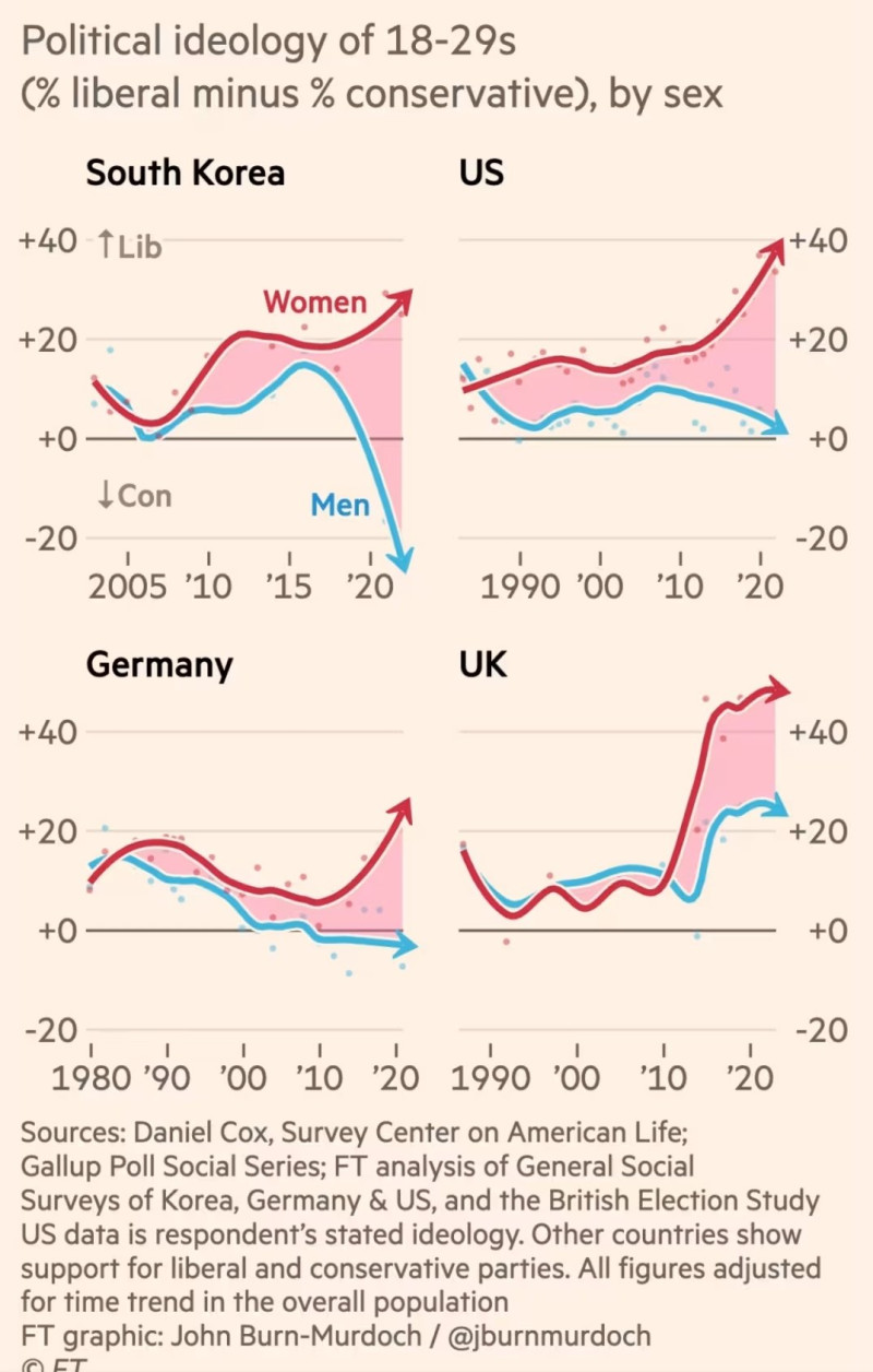 Artykuł w Financial Times opisujący gwałtowne rozchodzenie się poglądów politycznych i społecznych kobiet i mężczyzn.