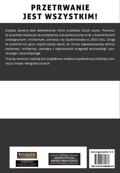 Książka zawiera dwa diametralnie różne przekłady Sztuki wojny. Pierwszy to przekład stylizacja na przepiękną staropolszczyznę wraz z komentarzem sinologicznym i militarnym, pierwszy raz wydany w 2020 roku. Drugi to przekład na język współczesnej nauki, do formy zaawansowanej analizy naukowej i militarnej, czerpiący z najnowszych osiągnięć antropologii, psychologii i neurofizjologii. Trzecią wreszcie częścią jest pogłębiona analiza współczesnej chińskiej koncepcji wojen nieograniczonych.