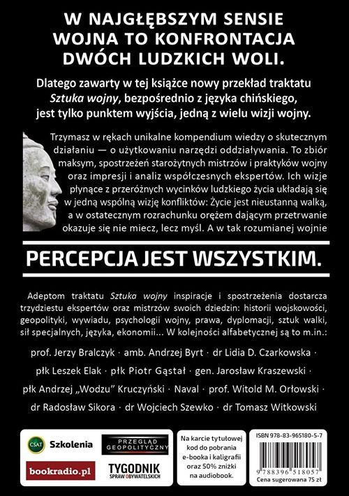 Co w  środku: Całkowicie nowy przekład starożytnego traktatu – bezpośrednio ze starożytnego oryginału. • Wypowiedzi i wizje o naturze wojen i naturze ludzkiej ekspertów takich jak prof. Jerzy Bralczyk, prof. Witold Orłowski i ponad dwudziestu innych. • Słynnemu dziełu towarzyszą wypisy z innych traktatów wojskowych, w tym nigdy wcześniej nie przekładanych na języki zachodnie. • Język przekładu starożytnych tekstów stylizowany na wspaniałą, starą polszczyznę.