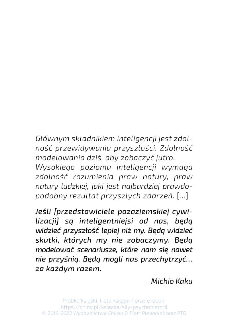 Głównym składnikiem inteligencji jest zdolność przewidywania przyszłości. Zdolność modelowania dziś, aby zobaczyć jutro. Wysokiego poziomu inteligencji wymaga zdolność rozumienia praw natury, praw natury ludzkiej, jaki jest najbardziej prawdopodobny rezultat przyszłych zdarzeń. […] Jeśli [przedstawiciele pozaziemskiej cywilizacji] są inteligentniejsi od nas, będą widzieć przyszłość lepiej niż my. Będą widzieć skutki, których my nie zobaczymy. Będą modelować scenariusze, które nam się nawet nie przyśnią. Będą mogli nas przechytrzyć… za każdym razem.